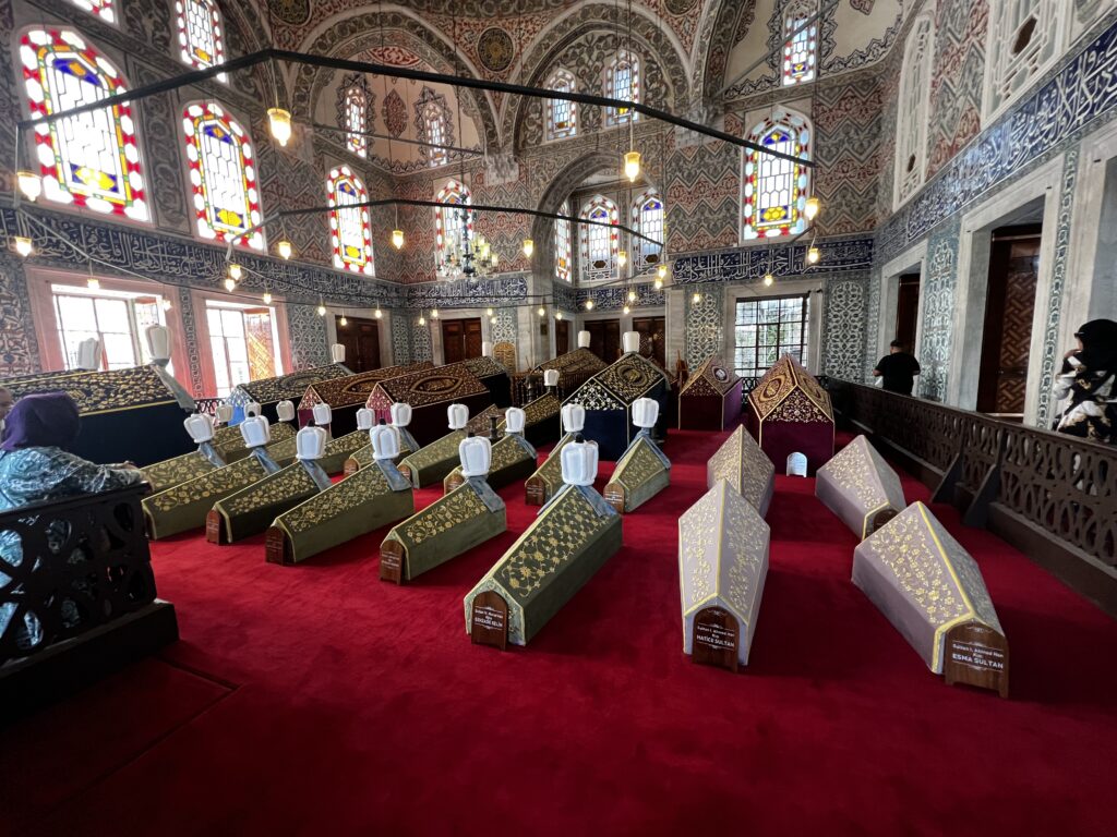 写っている棺は、オスマン帝国第14代皇帝「スルタン・アフメット1世」を中心に、その家族(妃や息子たち、皇子たち)が眠る場所です。主な人物は以下の通りです。
