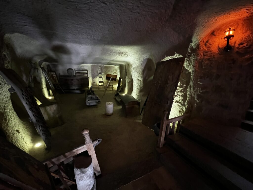 構造: 内部はまるでアリの巣のような迷路状になっており、狭い通路や階段で各階層が結ばれています。居住空間だけでなく、教会、学校、厨房、ワイナリー、食料貯蔵庫、家畜小屋、さらには墓地まで備わっており、長期間にわたって自給自足の生活ができるよう設計されています。