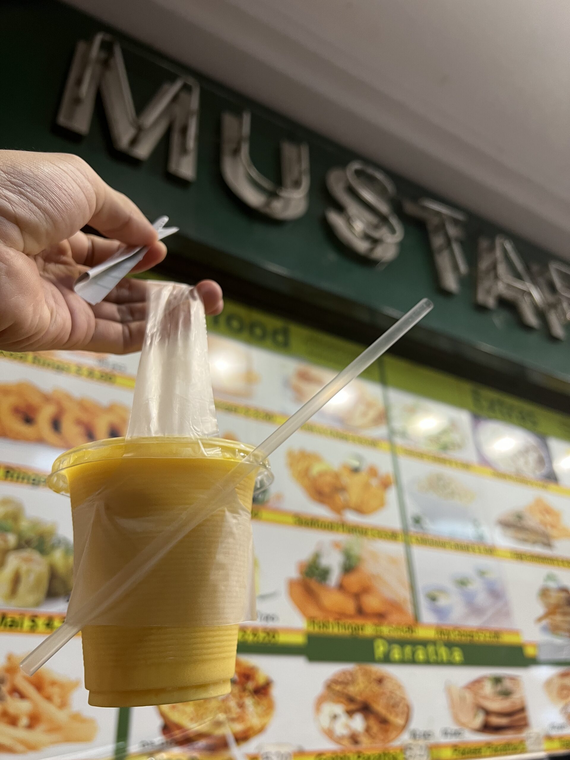 また寄り道してムスタファ近くでマンゴーラッシーをテイクアウト。