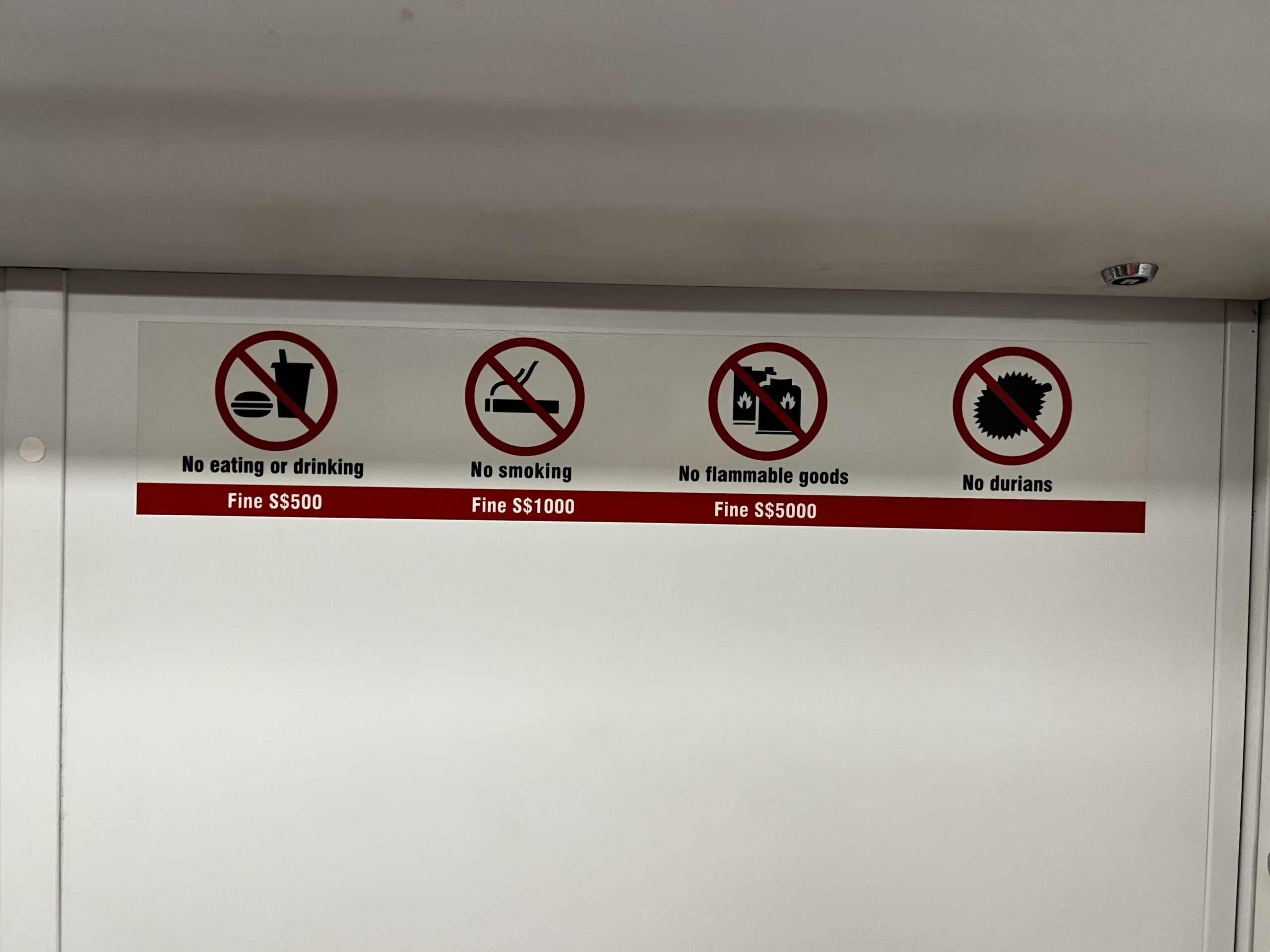電車の掲示板。シンガポール名物です。飲食禁止、ドリアン禁止。