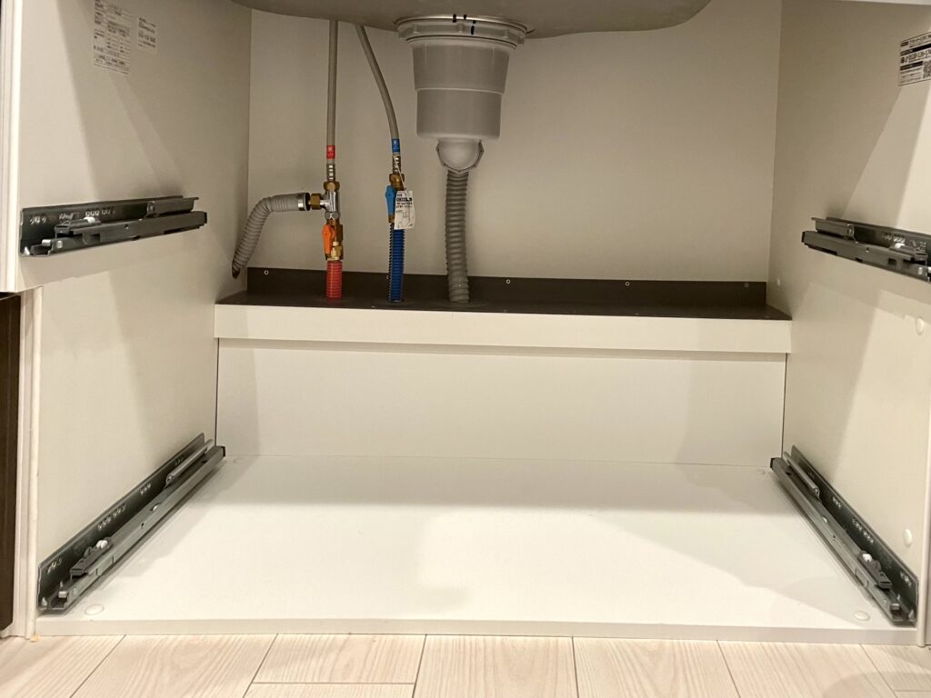 キッチンの下。お湯の官は食洗機へ伸びています。それにしてもアングルが厳しい感じに設置されている。。。