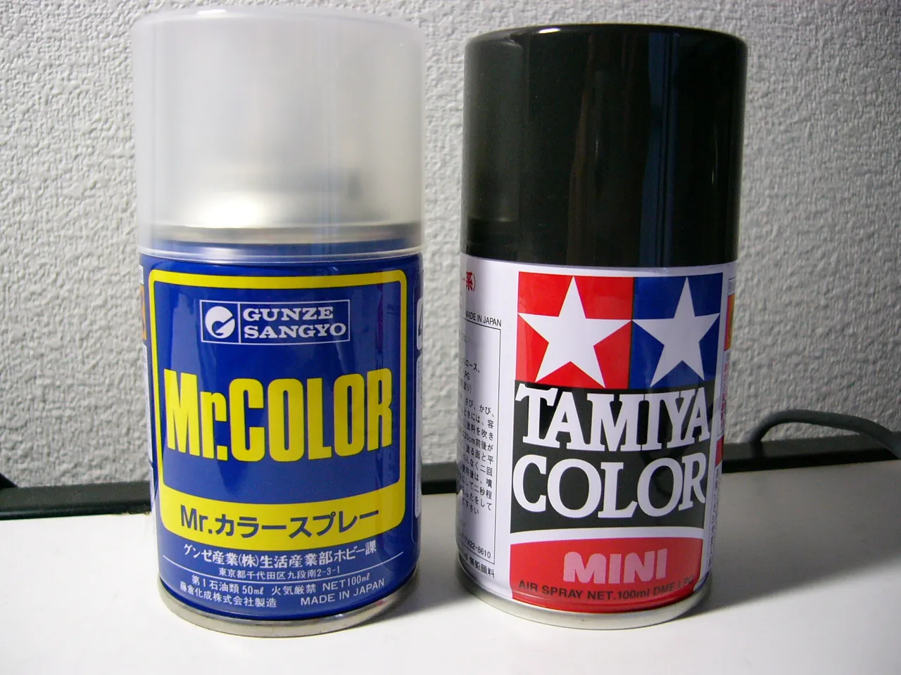 両方同じ溶剤じゃないと、溶けるよ。今回は、Mr.COLORのクリアと、TAMIYAのスプレー。プラモデル用。