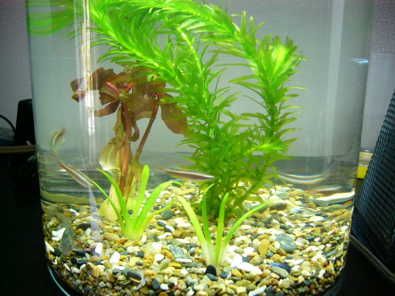しかも、濾過器やヒーターがいらないから、360度周りからのぞける!あと、魚がぐるぐる回って泳いでるの!ふつうの水槽は直方体だから、魚は左右をいったりきたりしてるだけだけど、円筒形だとぐるぐるまわれるの!葛西臨海水族園のまぐろみたいなイメージ。円筒形の方が、魚が心おきなく泳いでいる感じがして、いいね~~。