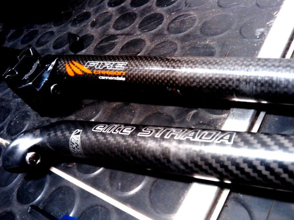 シートピラーは価格幅がありすぎてすごい困った。安いモノでは1000円。高いモノは3万円!素材もカーボン、アルミ、アルミの支柱にカーボンのコーティングと、いろいろある。