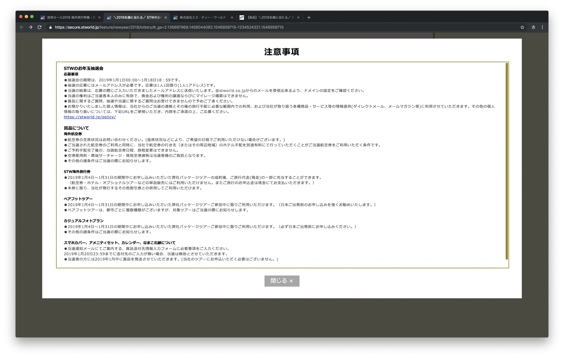 - 「合計2019人に当たる!」と書いてあるのに、何回か試したら毎回当たりがでる。アタリと行っても、一番低いレベルの景品である「STW海外旅行券1,000円分」が応募した直後にメールで当選通知が送付される。