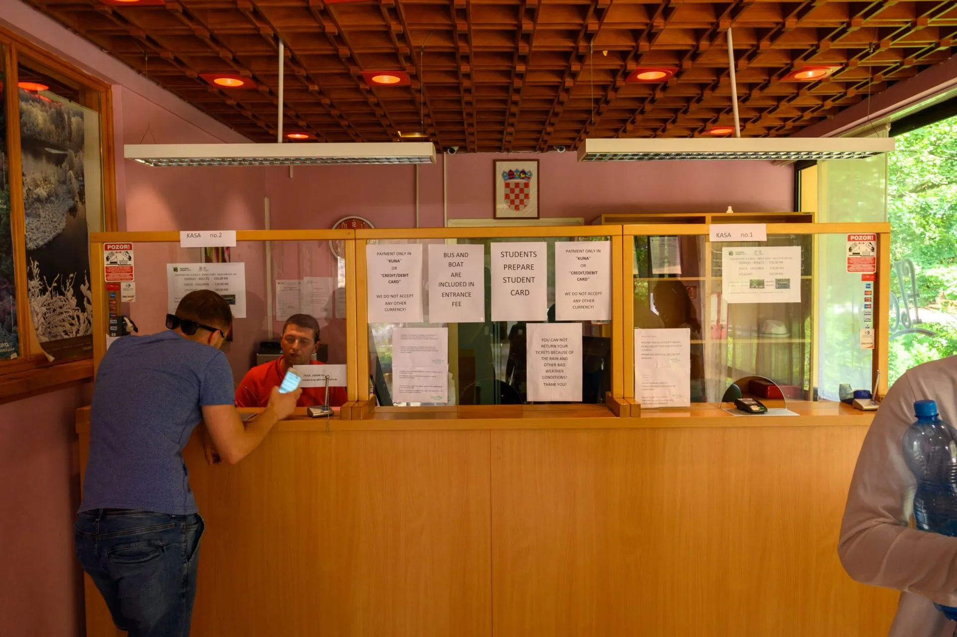 プリトヴィツェ湖群国立公園へ。ツアーガイドの若いお兄ちゃんがチケット係と揉めているところ。ここは市街地からとても遠いですが世界遺産なので非常に混んでいて30分枠の時間制。全員同じ時間枠で予約が獲れていない問題。結局は、同行していたおばさんがいざこざを起こして、全員遅い時間に合わせて入場。