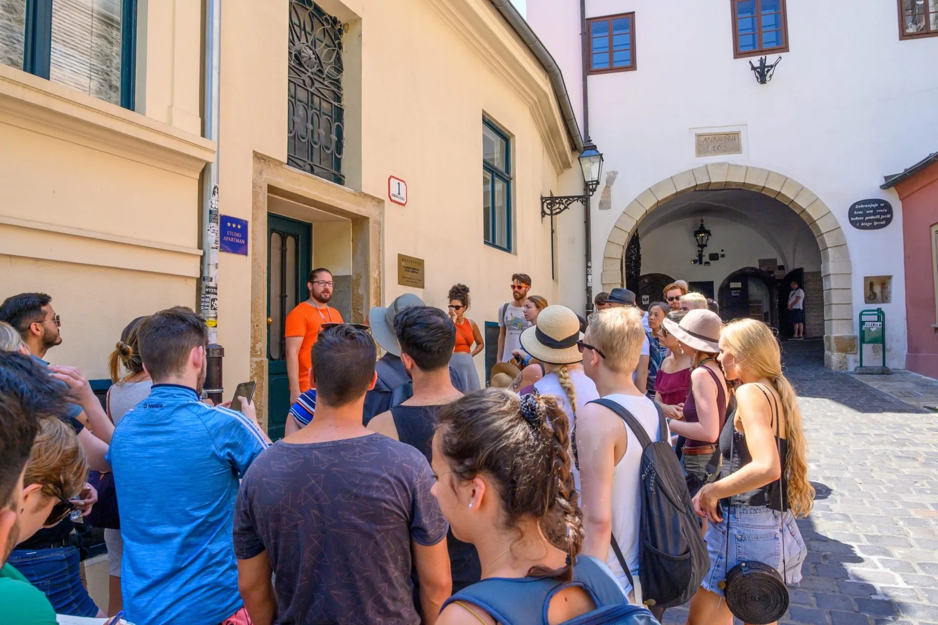 無料のウォーキングツアーがあるとのことで、広場の適当なところでみんな待っている図。10分遅れでツアーガイドが到着。