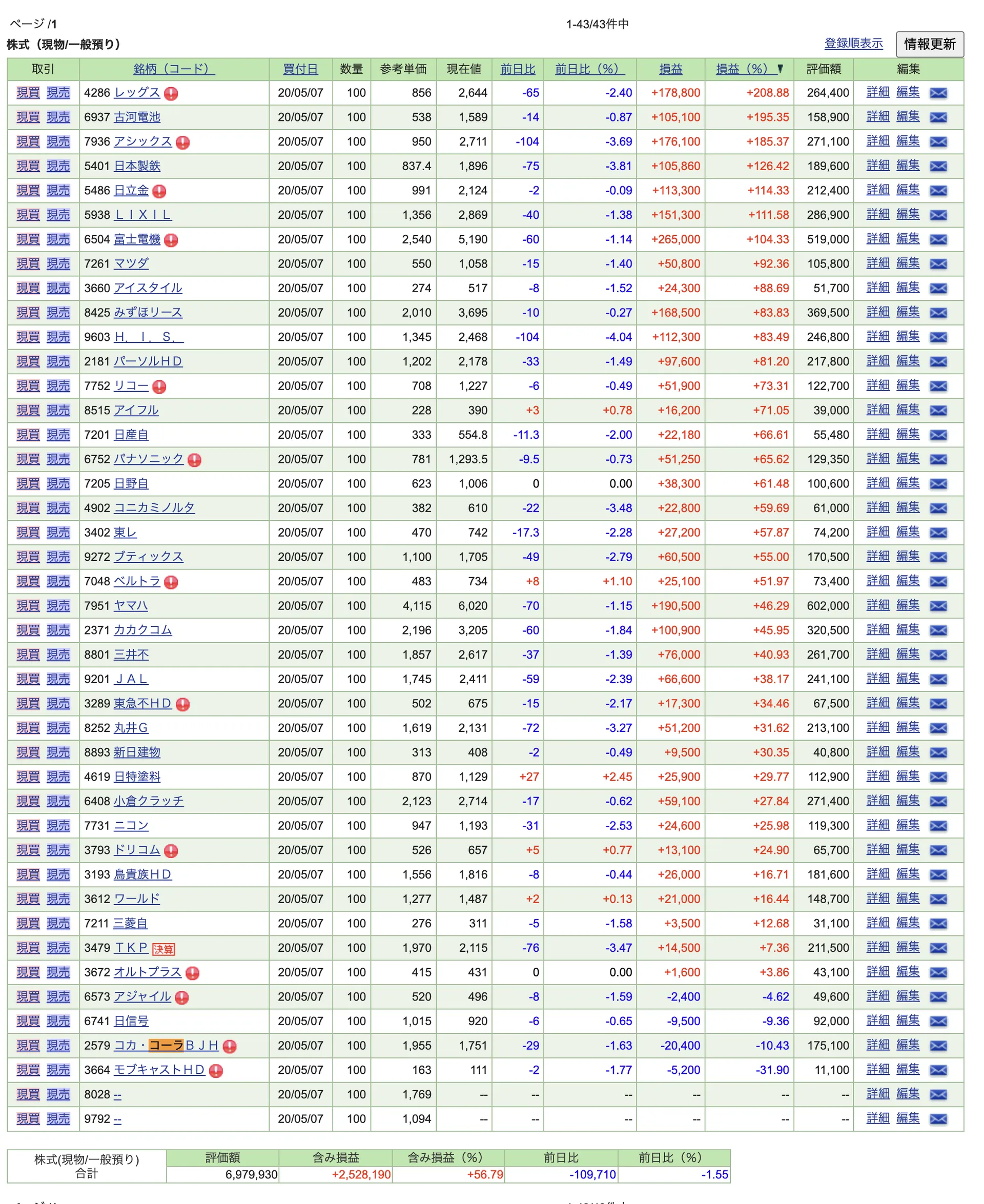 - 9792 ニチイ学館 1,665円 (取得値 1,094円, +571円)