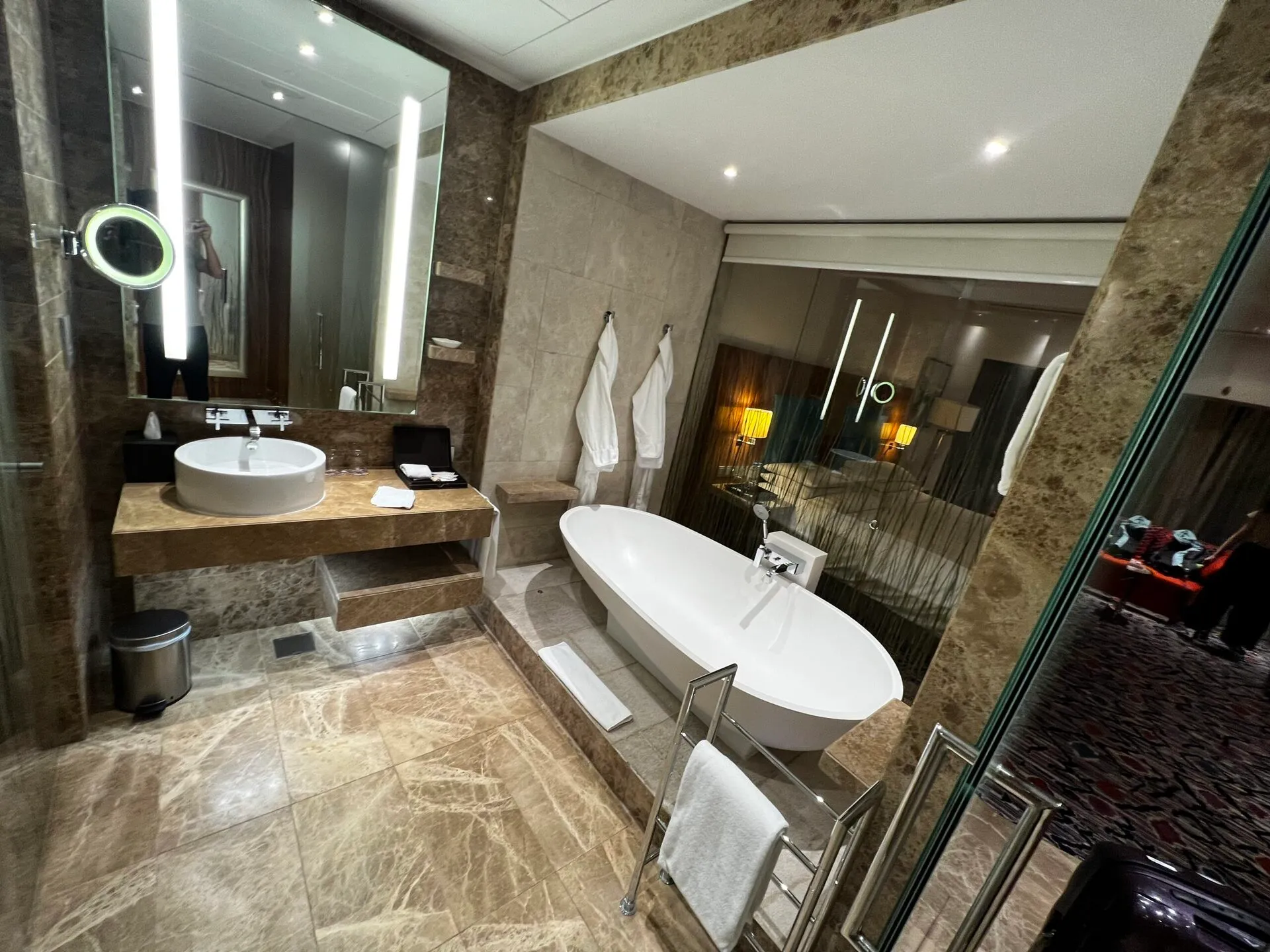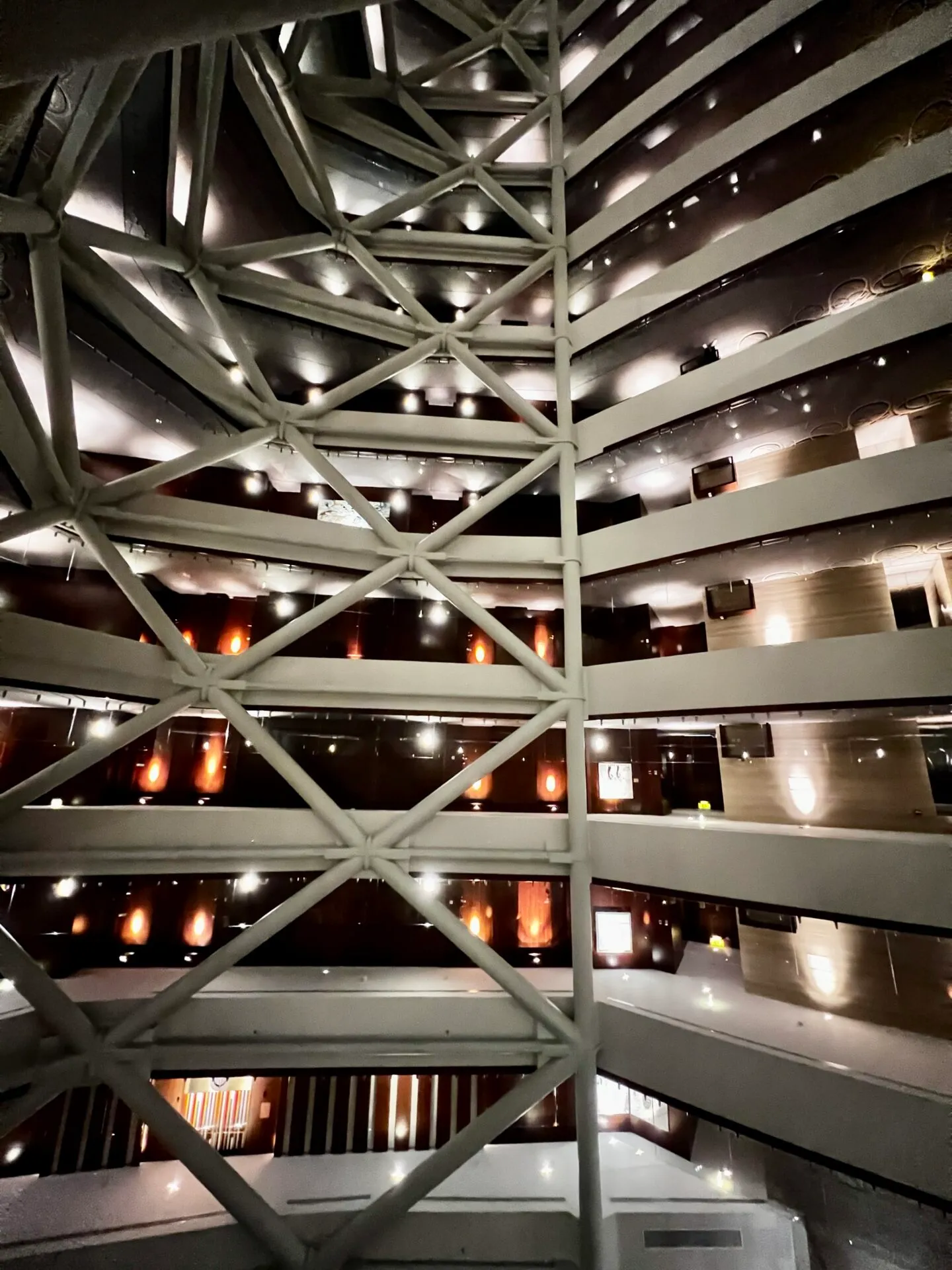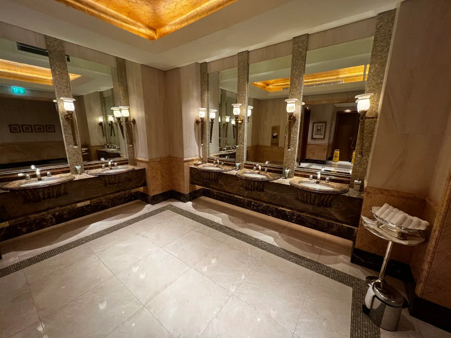 駐車場からホテルへ向かい、エントランスから一歩足を踏み入れると、そこはまさに「宮殿」。天井まで続く巨大な吹き抜け、金と大理石で彩られた内装は、豪華絢爛という言葉がふさわしい空間です。